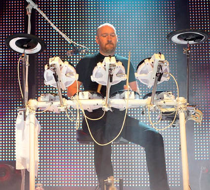 For years they have been using the Roland AX-7 Keytars and JV90s (I think) as MIDI controllers for the rack systems. The old Roland vintage GR guitar has shown its face also. Recently from what I understand they use 2x Roland Fantom G as a synth/sample solution, using internal waveforms and samples and the iconic AX-7 O`h and the Roland TD drum setup. We also saw the appearance of the Roland SH-101 this year.